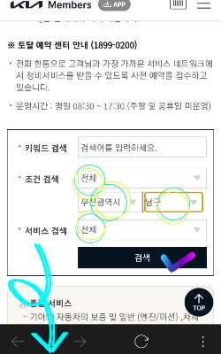 2) 조건 검색 전체, 지역 선택, 서비스 검색 전체, 그리고 검색을 누른 다음 아래로 스크롤 합니다.